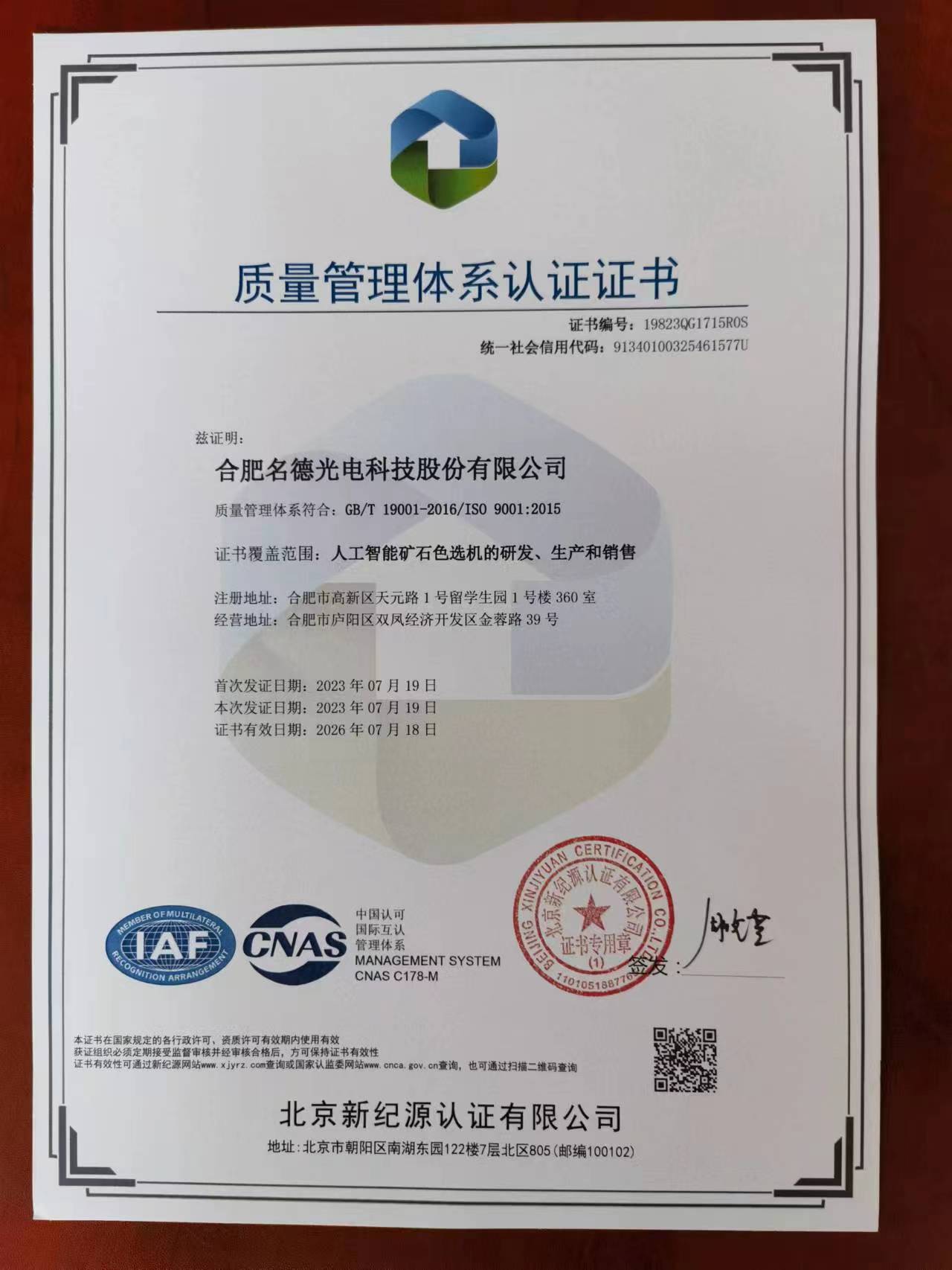 合肥名德光電科技股份有限公司,成立于2014年,總部位于合肥,是一家專業(yè)從事礦業(yè)智能分選、智能分揀機(jī)器人和礦業(yè)裝備研發(fā)、設(shè)計(jì)、制造、銷售、服務(wù)的高新技術(shù)企業(yè),公司自建有40余畝的生產(chǎn)研發(fā)基地,擁有20000平標(biāo)準(zhǔn)化廠房和科研中心。