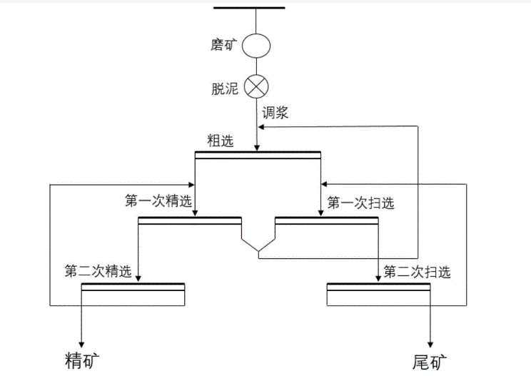 磨后物料經(jīng)調(diào)漿后,進入重選階段(去除鉭、鈮等產(chǎn)品),重選尾礦經(jīng)濃縮機濃縮脫泥后,通過添加油酸及氧化石臘皂進行調(diào)漿,在高堿度條件浮選出鋰輝石精礦,再經(jīng)強磁選進一步除鐵雜質(zhì)進行提純。