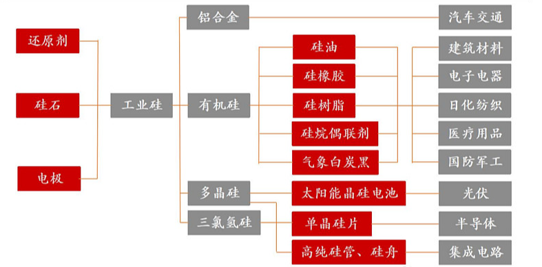工業(yè)硅的下游應(yīng)用廣泛,按行業(yè)應(yīng)用產(chǎn)品可細(xì)分為多晶硅、有機硅和合金硅;其中,多晶硅又可以進(jìn)一步冶煉成單晶硅。多晶硅(單晶硅)多應(yīng)用于光伏產(chǎn)業(yè)和半導(dǎo)體產(chǎn)業(yè),合金硅主要應(yīng)用于汽車制造產(chǎn)業(yè);而有機硅不斷應(yīng)用于傳統(tǒng)行業(yè)(醫(yī)療器械、電子器件),還應(yīng)用于新興產(chǎn)業(yè)像是5G基站等。