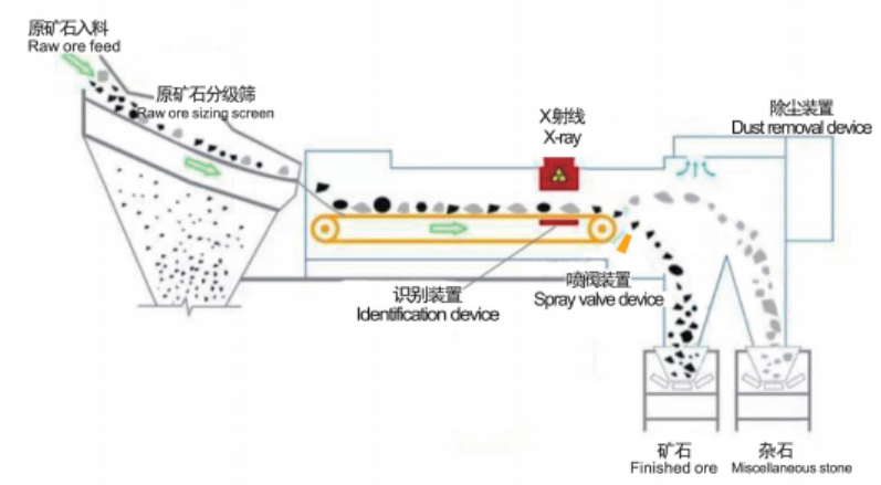 X光智能分選機,可預先提精拋廢——提前分選高品位矸石伴生礦,達到經(jīng)濟開采品位,直接增加企業(yè)收益,大幅減少進入“研—磨—碎”工序的矸石量,有效拋除矸石中的廢石,降低矸石處理量和處理成本,間接提高礦山原礦的綜合效益,又降低對環(huán)境的污染和尾礦的產(chǎn)生,達到了資源最大化利用,變廢為寶,也符合國家綠色礦山發(fā)展方向。