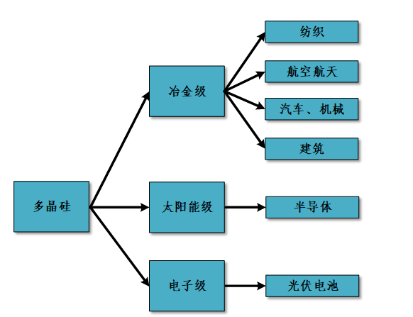 根據(jù)硅含量純度的不同,多晶硅可以分為冶金級、太陽能級和電子級多晶硅。冶金級多晶硅是通過在電弧爐中將硅的氧化物與碳還原而成,通常含有約95%的硅,有些甚至高達(dá)99.8%以上。主要用于航空、尖端技術(shù)、軍事技術(shù)領(lǐng)域的特種材料,以及建筑、紡織、汽車和機(jī)械等領(lǐng)域。太陽能級多晶硅的純度介于冶金級和電子級之間,一般認(rèn)為含有99.99%至99.9999%的硅,主要用于太陽能電池。電子級多晶硅要求含有99.9999%以上的硅,主要用于半導(dǎo)體工業(yè)。