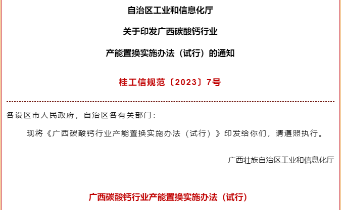 日前,廣西工信廳發(fā)布了《關(guān)于印發(fā)廣西碳酸鈣行業(yè)產(chǎn)能置換實(shí)施辦法(試行)》的通知,文中對(duì)于產(chǎn)區(qū)內(nèi)碳酸鈣產(chǎn)能置換的要求、管理、監(jiān)督提出了新要求,并在附件中發(fā)布了廣西碳酸鈣粉體產(chǎn)品定義及置換產(chǎn)能大小核定原則。